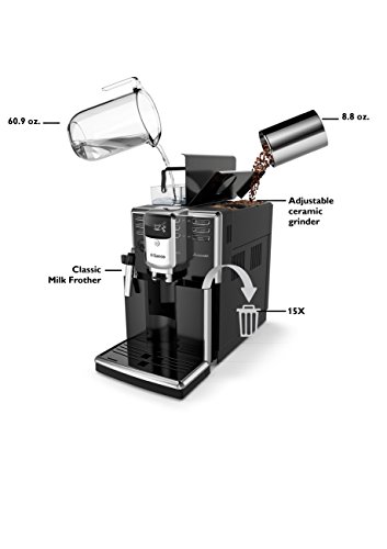 Large capacities in compact design: 8.8oz Bean Container, 15x Waste Container; 60.9oz