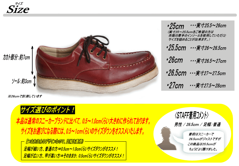 | サイズ | 作り⇒大きめ 【サイズ選びのポイント!】 足幅が細い方、普通の方⇒0.5cm~1.0cmくらいサイズダウンがオススメ! 足幅が広い方、甲が高い方⇒0.5cmくらいサイズダウンがオススメ! ▼ご確認下さい!▼ 本品は通常のスニーカーブランドに比べて,0.5~1.0cmくらい大きめに作られております。サイズをお選びになる際には,0.5~1.0cmくらいのサイズダウンをオススメいたします。 |