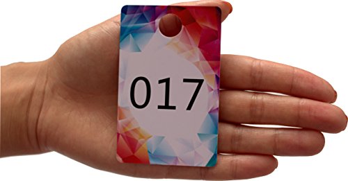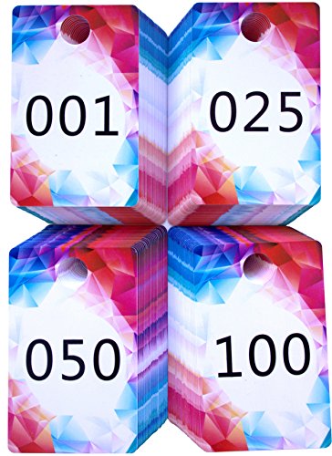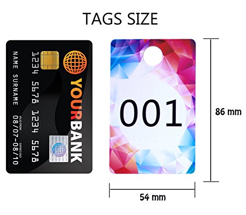 -. Feature : 1 Set of 100 Consecutive numbers 001-100, 1 side normal (Glossy) & 1 side backwards numbers (Matte, anti-glare)! / Reverse numbers so the viewer sees the number correctly when watching your live sale, looking at the correct number you can be sure that the buyer sees the correct number! / Professional looking hard plastic tags with easy-to-read digits, environmentally Responsible 100% Recyclable. / Bonus of 10 additional cards, without figures, in case of loss and you can write a marker any number! A convenient box for storage! / Dimensions: 3.37 Inch X 2.13 Inch with a ½ Inch hanger hole! For comparison it is the size of the credit card!