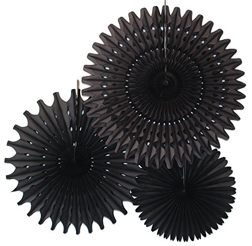 [Product Information]- Beautiful set of three black honeycomb tissue paper party fans - one 13 inch fan, one 18 inch fan, and one 21 inch fan