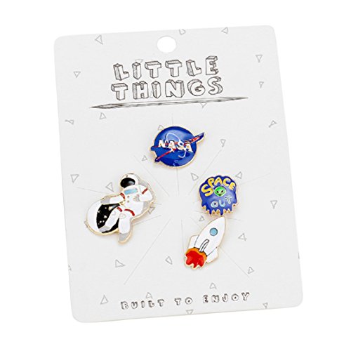 -. Feature : Four different designs of astronomy related pins for jackets, coats, hats, clothing / Whimsical space and space travel themed colored enamel earrings / Designs include: NASA emblem; "Space Out" alien; rocket; astronaut on moon / Size vary from 0.6" to 1" / Packaged in a lovely gift box