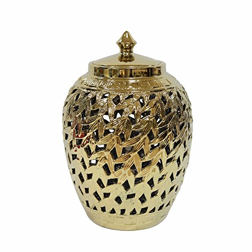 Benzara Beautifully Designed Pierced Ceramic Covered Jar, Gold