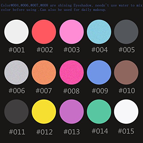 Color#004,#006,#007,#008 are a little shining ,differnt from other colors .Those are Eyeshadow ,needn't use water to mix color before using .Can also be used for daily makeup.Color#001,#002,#003,#005,#009,#010,#11,#12,#013,#014,#015 are wated based paint .Feature