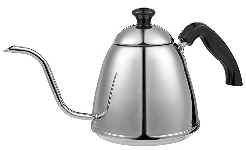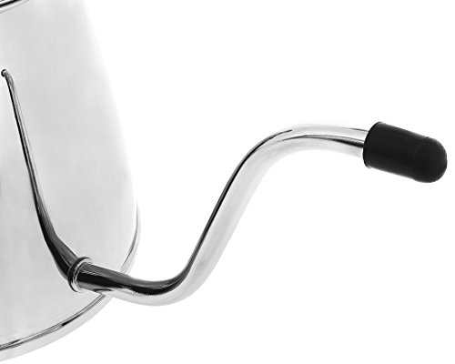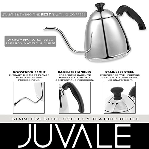 Start brewing the best tasting coffee with Juvale's Pour Over Drip Coffee and Tea Kettle. This pour over kettle sports a sleek, stainless steel finish that will be a great addition to any kitchen. It features a gooseneck, curved spout that allows for a slow and precise pour in order to extract the most flavor. Full capacity is 0.9 liters which pours approximately four cups. The stylish, upscale look of the stainless steel pour over kettle makes for a great gift for coffee enthusiasts.Feature