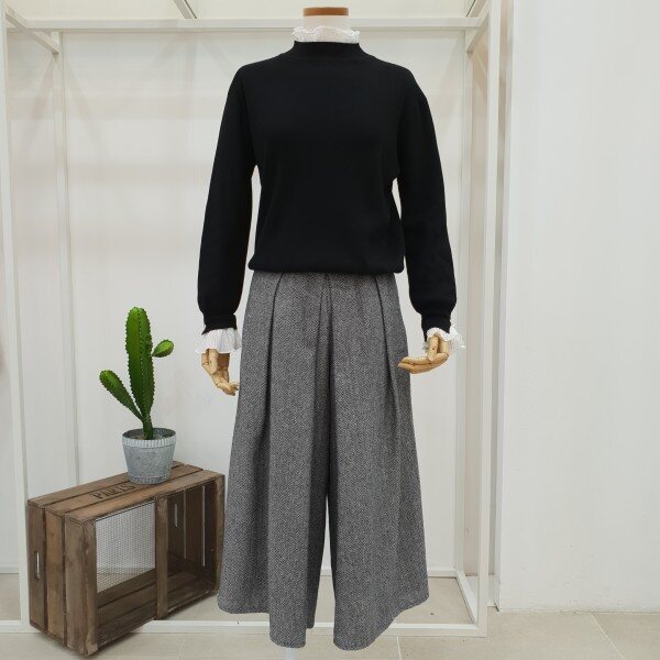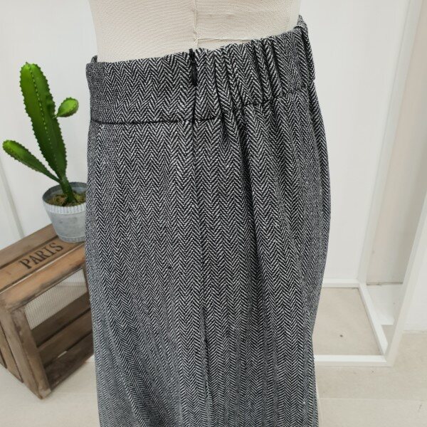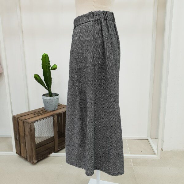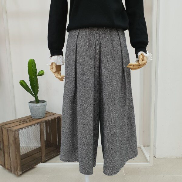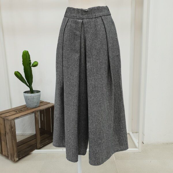 반에이크 헤링본 패턴의 와이드팬츠입니다. 치마처럼 보일정도의 와이드 슬렉스이며, 허리라인을 강조하는 스타일로 예쁘게입기 좋으세요. 맨투맨보다는 약간 붙는 상의와 매치하시는게 더 예쁜제품입니다^^