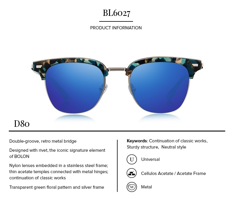 Designed with rivet, the iconic signature element of BOLON, these sunglasses have nylon lenses embedded in a stainless steel MULTICOLOR frame. The double-groove metal bridge and the thin acetate temples are a continuation of classic works. Feature a BLUE color HD POLARIZED and UV 400 protection lenses to ensure a maximum comfort. Comes with a free premium black leather protective case & a branded cleaning cloth.