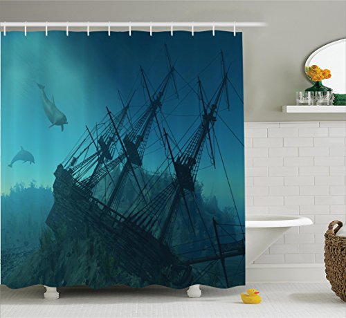Nautical Decor Shower Curtain Set By Ambesonne, Dolphins Approaching To The Ruined Wreckage Of Underwater Sunken Ship Mystery Treasure Theme, Bathroom Accessories, 69W X 70L Inches, Petrol Blue