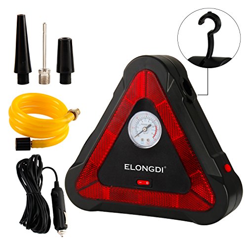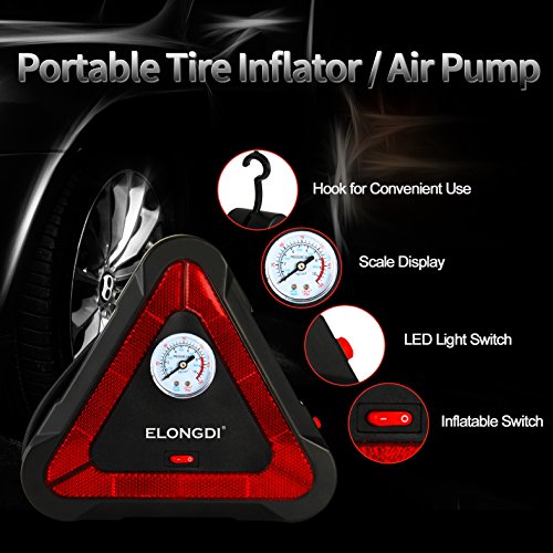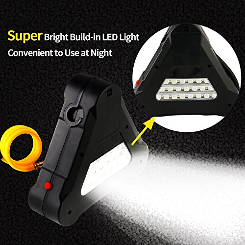 - Safety Warning Tripod & Build-in LED Light: Unique design which makes it not only works as a car tire inflator, as well as a safety warning triangle reflector, long distance reflection over 330 feet. Back side of tire inflator with bright build-in LED light which is humanized and you could even maintain your car at night