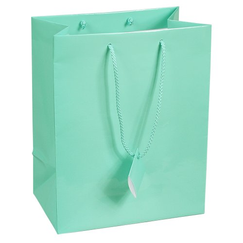 10 pcs Large Fancy Robin's Egg Blue Glossy Finish Shopping Paper Gift Sales Tote Bags with Blank Message Tag 7.75" x 4" x 9.75"