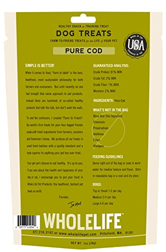 -. Binding : Misc. -. Brand : Whole Life Pet Products -. EAN : 0895777000540 -. Feature : 100% Pure Human Grade Freeze Dried Wild Atlantic Cod Treats / Protein rich plus low in fat & calories-a healthy snack for any dog or cat / Sourced, produced and packaged in the USA / Every batch tested and verified safe / Made in-house in small fresh batches daily-by our pet loving staff -. Label : Whole Life Pet Products -. Manufacturer : Whole Life Pet Products -. Model : 895777000540 -. MPN : 895777000540 -. NumberOfItems : 12 -. PackageQuantity : 1 -. PartNumber : 895777000540 -. ProductGroup : Pet Products -. ProductTypeName : PET_SUPPLIES -. Publisher : Whole Life Pet Products -. Size : 1oz -. Studio : Whole Life Pet Products -. Title : Whole Life Pet Single Ingredient USA Freeze Dried Cod Filet Treats for Dogs, 1-Ounce -. UPC : 895777000540