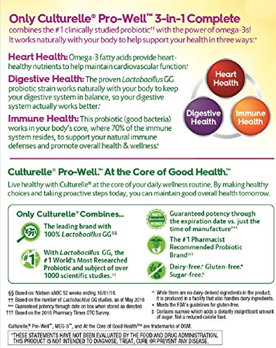 Only culturelle pro-well 3-in 1 complete formula combines the #1 clinically studied probiotic with the power of omega-3s! This formula naturally helps support your health in three ways. Making healthy choices and taking proactive steps today, can help you maintain good over all health tomorrow. Culturelle pro-well 3-in 1 complete formula is specially formulated to keep you feeling active, healthy and well, your best self.Feature