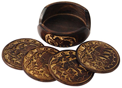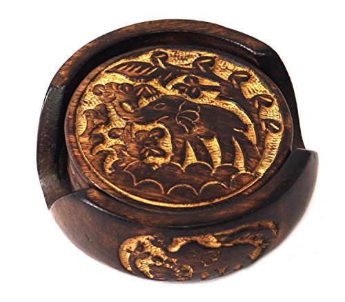 -. Brand : Super India -. Color : Brown -. EAN : 8903605046065 -. Feature : **IMPORTANT NOTE** - The images and page information for this product have been created by 'Super India Store'. You will get exactly what you see only if you order from Super India Store. / **FREE Gift Box Packaging worth $1.99 as shown in image with secured "Bubble Wrap" for Product inside. / **PLEASE CONFIRM** Original Seller "Sold by Super India Store' and Fulfilled by Amazon" before you add it to the cart. Genuine Super India Store. product - beware of imitations! A quality decorative hanging by Super India Store Inc. / Wooden coaster 3.65 Inches is completely handcrafted. Handcrafted from the strong and durable Indian Rosewood - one of the finest richly hued timber available / With the holder and brass inlay, it will be perfect to protect your surfaces while adding a fun touch The eye-catching floral carvings has been hand worked with passion and attention to detail. Handmade in Saharanpur, the handicraft hub of India - world famous for all and any kinds of high quality wood and iron ware. -. Label : Artisans of India -. Manufacturer : Artisans of India -. Model : 6108146 -. MPN : 6108146 -. PackageQuantity : 1 -. PartNumber : 6108146 -. ProductGroup : Kitchen -. ProductTypeName : KITCHEN -. Publisher : Artisans of India -. Studio : Artisans of India -. Title : Elegant Antique Look Hand Carved Wooden Coasters Set of 4 with Holder Elephant Trunk-up Floral Wood Carving