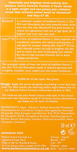 -. Binding : Misc. -. Brand : Balance Active Formula -. EAN : 5012368040746 -. Feature : Best Vitamin C Serum. Brighter complexion and even skin tone. Decrease the appearance of age-spot Smoother and firmer skin Light-weight and non greasey Active levels of Illumiscin and Stay-C 50. / Suitable for ALL skin types / Free from Parabens -. Label : HealthMarket -. Manufacturer : HealthMarket -. Model : 04034BAL -. MPN : 04034BAL -. PackageQuantity : 1 -. PartNumber : 04034BAL -. ProductGroup : Beauty -. ProductTypeName : BEAUTY -. Publisher : HealthMarket -. Studio : HealthMarket -. Title : Balance Active Formula Vitamin C Power Serum 30ml