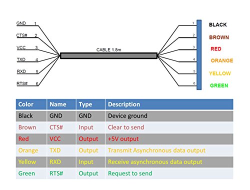 6 way outputs provide Tx, Rx, RTS#, CTS#, VCC and GND. Data transfer rates from 300 baud to 3 Mbaud at TTL levels