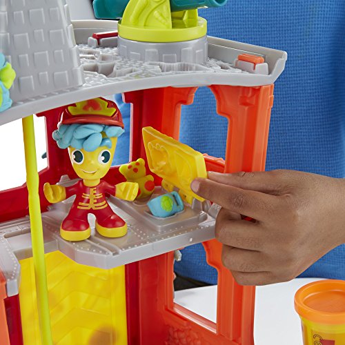 Hey, chief -- there's a fire in Play-Doh Town! Luckily the Firehouse is right nearby, and this can-do firefighter is ready to squish out the Play-Doh flames. Create an emergency scene by stacking the Play-Doh cans and putting the roof on top. Use the fire stamper to add colorful flames, and squeeze a silly escape pole. The half-molds shape other rescue essentials, like a radio or an alarm bell. Get the firefighter ready by creating a wild hairstyle and putting on his hat. Use the stamps on his feet to make his radio and a pretend treat for his pup. Help him battle the flames with the water cannon extruder, make a hose with the fire hydrant, or chop the flames out with the axe, which also fits in the firefighter's hand. And make sure to take the dog for a walk, or it might have its own emergency! The garage can also fit the Fire Truck (sold separately) for even more rescue missions. Playing the hero (or even the mischief-maker) can be a new adventure every time in Play-Doh Town!