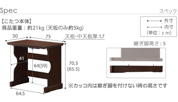 幅75x奥行50x高さ65.5/70.5cm(継脚5cm)