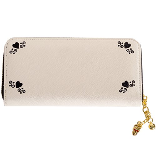 Product Description - Material: 100% Simulated Leather (Polyurethane) - Lining: 100% Polyvinylchloride - Dimensions: approx.20 x 3 x 9,5 cm - Embroidered Sugar Skull and hearts - One zip compartment for coins - Two large compartments for banknotes - 8 card holder slots - Two long slots on sides - Closes with zipper - Banned charms on zipper
