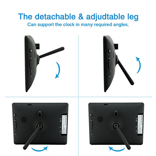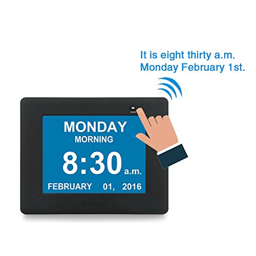 Upgraded Version is released on 10th of October 2016. What makes this clock outstanding? It speaks the time. The patent protected unique design gives an attractive outlook. The voice button located on the upper right corner is the only button on the face of the unit so it is easy to see and use. Simply push the button and it talks exactly what's on the screen. Those with cognitive impairment, dementia, Alzheimer, visions problems, or weak memory loss, etc can use it to listen to the time and the day. Perfect for people forgetting the day. An easy-to-reach thumbnail wheel is designed for adjusting the backlight brightness with choices of 4 optional font or background colors for individual preferences, many users have been able to sleep with it in a dark room without affecting their migraines. Turning to a higher brightness level, it can also be used as a night light. As well being a digital photo frame, this is a great gift for anyone. Photos in various formats can be displayed on the screen. With an option to change the color of the letter/numbers and background, the clock display provides the contrast best suited to individual needs. Very easy to use. All you need to do is plug in the power supply and the clock is set to the correct Eastern time, day, and date. You may just need to set the time for a different time zone. It retains the correct time even you unplug the power supply. Perfect Gift. With an adjustable support leg, the clock can stand at different angles to suit different surfaces in different rooms (kitchens, labs, office desks, shop front desks, hospitals, or nursing homes, etc). It can also be mounted on the wall. A great present for family or friends. Size details: Clock width - 9 1/8 " Clock height - 7 1/4" Clock thickness - 1 3/4 " Week day lettering - 3/4" x 1/2" Time digit - 1 5/8" x 1" Month and day lettering - 3/8" x 1/4" 0 |