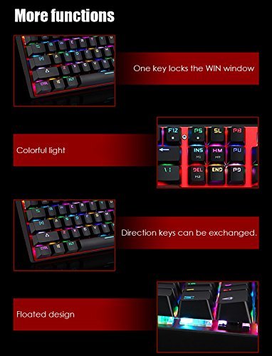 -. Feature : Multi-Color Adjustable LED. Backlit in 6 different colors, 9 light effect mode and built-in 8 lighting arrangements for certain game types, including a setting for WASD games. / Anti-Ghosting 104 KEYS and N-KEY Roll Over. Allows multiple keys to work SIMULTANEOUSLY. Each key was controlled by an independent switch, ensuring a gaming-grade responsiveness with high-speed. / Wide Compatability. Suitable for most computer system including Windows10,Windows 8, Windows 7, Mac OS X, Windows XP, Windows VISTA and so on. / Sensitive and Responsive. Easy to press and fast response, and you don¡¯t have to press the keys with great force. The clicky sound is pleasant, which makes gamers look cool and awesome. / Support common game mode key backlight and custom recording backlit function. Support 9 cool LED lighting effects.Support all mode, FN + "←/→" five speed regulation, support FN +"↑/↓" five brightness control. Support 6 key/N key mode switches automatically. Support WIN Lock function and LED lamp effect indication. Support the "FN + ESC"reset function.Support the FN + PS, close/open backlight function.