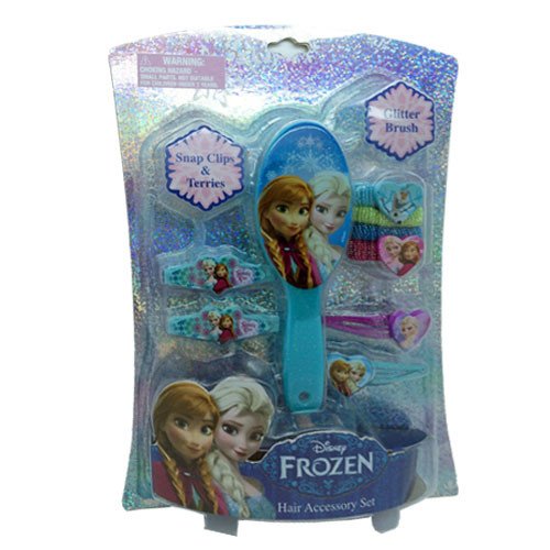 Disney Frozen hair accessories blister set. Includes one glitter brush, 4 glitter terries, 2 glitter snap clips and 4 barrettes. Suitable for all children ages 3 and up. Comes packaged in a Frozen printed box featuring Princess Anna, Princess Elsa and many more of your favorite Frozen characters.Feature