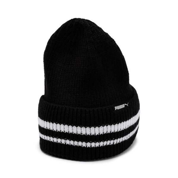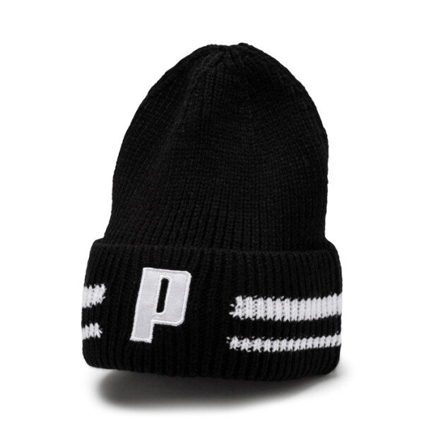 오버 사이즈 핏의 플레인 니트 비니.푸마 캣 로고가 메탈 소재로 전면에 부착되어 있음.