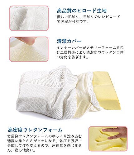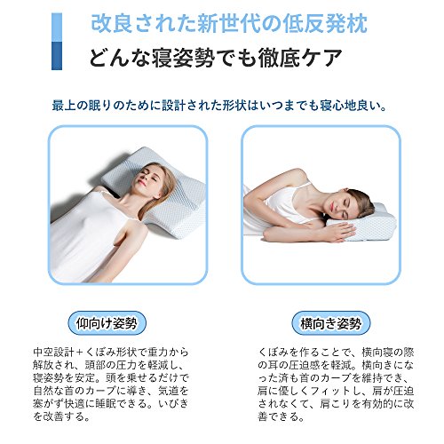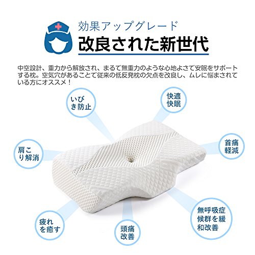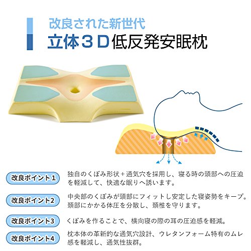 [Improved the new generation, effects upgrade] shape that has been designed for the best sleep is also comfortable good forever. Employs a unique dimple design + ventilation holes, the "ideal sleep" to be released from gravity to your original. Have empty air hole to reduce the urethane foam peculiar sense of stuffiness, it is the best excellent ventilation, even in the summer. [Cervical vertebrae relax, gravity release] have depressed the center, keep fit and stable posture in the head. The cervical spine is supported firmly gently, to reduce the burden on the cervical spine. Foam pillows of new generation, to improve the ordinary concave pillow, innovative hollow design of the pillow body, gravity load on the sleep head, neck, shoulder has been devised so as to be minimum. [Head vacuum, snoring prevention] When sleep in supine, the hollow design + shaped depression, the pressure of the head is reduced, stable posture. Led to the curve of only a natural neck put your head, you can sleep comfortably not block the airway. To improve the snoring. [Osshayoko Rakune, stiff neck measures] to make a depression, reduce the tightness of the side of the head and ears at the time of sleeping sideways. Have to have a thickness on both sides, already it became sideways can also maintain the curve of the neck, gently fit on the shoulder, the shoulder is not being squeezed, you can effectively improve the stiff neck. In [stereoscopic 3D foam sleep pillow] unprecedented special three-dimensional shape, has "super-gravity release," "ultra-high-breathable" "ultra-comfortable stable" These three features support a good night's sleep. Pillow of the improved version that takes into account a variety of body type, there is a slope before and after, you can choose the comfort from the two patterns (Enhanced-low). [Improved the new generation, effects upgrade] shape that has been designed for the best sleep is also comfortable good forever. Employs a unique dimple design + ventilation holes, the "ideal sleep" to be released from gravity to your original. Have empty air hole to reduce the urethane foam peculiar sense of stuffiness, it is the best excellent ventilation, even in the summer.