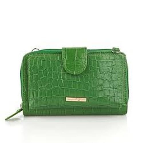 Keep your cell phone next to the things you prize most. Great as a clutch or simple wristlet, this cell phone wallet is fashionable and practical. The zip-around closure keeps cards out of sight, while giving you easy access when you need it. Good to Know Cellphone holster holds most phones including smartphone sizes up to 5"L X 3"W X 1/2"H. SPECS: Color: Green Style: Small east-west profile Walls: Croco-embossed leather Trim/Embellishments: Logo plate Exterior Pockets: Front elastic with magnetic snap tab; back zipper Hardware: Silvertone Closure: Zip-around Interior: Dual billfold slots; 6 card slots; ID window; interior zipper coin pocket; elastic pouch Lining/Trim: Logo fabric Additional Features: Removable manmade wristlet strap Size and Content Measurements: Approx. 6-1/4"L x 1-1/2"W x 4-1/8"H with 7-1/2" strap drop Shell: Genuine leather Lining: Nylon Country of Origin: Imported