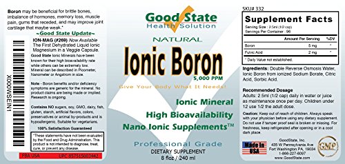 -. Binding : Health and Beauty -. Brand : Good State -. EAN : 0857515003442 -. Feature : Absorbs Much better than Pills! / 96 Day Supply - 5 mg of Ionic Boron per Dose / Easy to mix with Juice or Water / Professional Grade - Natural - Made in USA / Measure with Cap! -. Label : Good State -. Manufacturer : Good State -. MPN : 332 -. PackageQuantity : 1 -. PartNumber : 332 -. ProductGroup : Health and Beauty -. ProductTypeName : HEALTH_PERSONAL_CARE -. Publisher : Good State -. Studio : Good State -. Title : Liquid Ionic Minerals Boron (96 Days At 5mg. - Plus 2 Mg Fulvic Acid) -. UPC : 857515003442