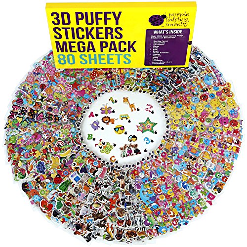 SOOOOO MANY STICKERS, NO REPEAT SHEETS! Get the same 40 sheets as our original Purple Ladybug Novelty 3D puffy sticker mega pack PLUS GET 40 MORE SHEETS with different designs that you won't find in our 40 sheet Mega-pack! WHAT YOU GET: Each sheet contains an average of 25 stickers and comes in its own sleeve. More than 2000 premium 3D puffy stickers with multiple themes and designs will keep anyone from preschoolers, elementary school students, teenagers to adults occupied for a long time! 3D PUFFY STICKERS ARE UNIQUE! These top-quality 3D puffy stickers are multi-layered to give a premium tactile sticker experience and allow for even more creativity. EASY ORGANIZATION, STORAGE AND CLEAN-UP! Our customized storage box allows you to keep them clean and organized. Plus it's convenient and since it's bright yellow, easy-to-find. AWESOME GIFT!!! Makes a great gift for kids, girls, boys and sticker-collectors of any age.Feature