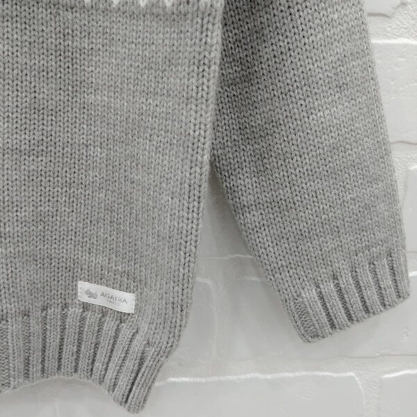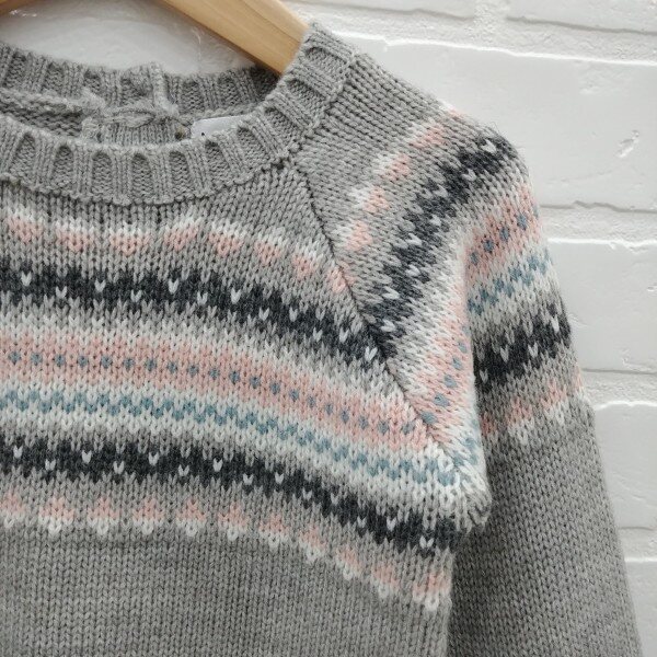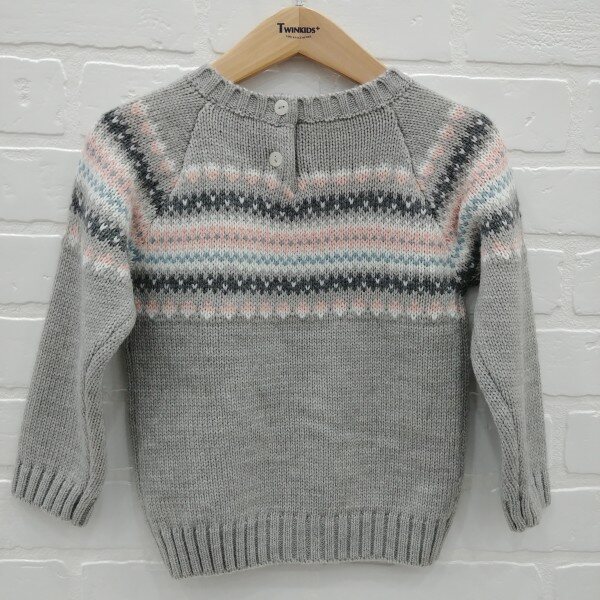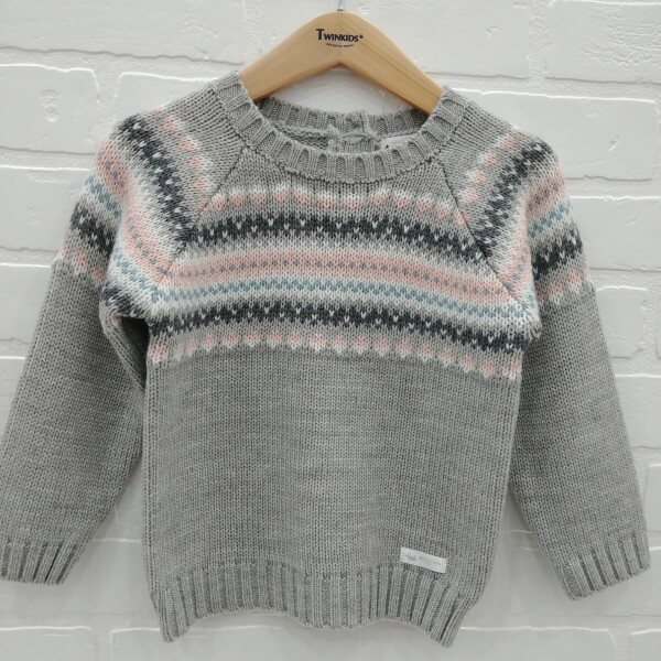 울이 함유된 여아니트, 따뜻한 컬러감의 노르딕 쟈가드 패턴으로 포인트를 준 스타일.