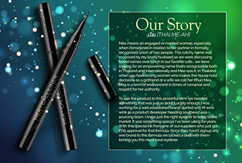 Who would have guess this small brush can bring such dramatic boldness to your eyes, with Ultra Black Hue. Loved by all, already mentioned on multiple media news cbs, abc, nbc and fox. No drizzle or spill can ruin your day with this waterproof elixir. This All day all night eyeliner will be your new bff plus it's easily removable using any makeup remover. Smooth to the touch with extra thin tips for precision finishes. Amazon Prime Product, No questions asked satisfaction or money back guarantee. Feather Brush Tip hermetically sealed in Spring top lid, Mea's 0.5 ml eyeliner is 5 inches long 0.37 inches wide enclosed in a beautifully designed box. Making this the prefect addition to your summer collection.Filled to the Top! Unlike other brands that fills only half the pen we don't! We want to give you the highest quality ink without sacrificing the value. It's so filled up you'll find that 5% of our liner has a "Wish drop" . Wish Drop is an overfilled liner that has a drop of ink on top of the tip when you first pop the top. Because it's so rare we are donating $1 to everyone who post #wishdrop #calliliner with a picture of the Calliliner Tip with a Wishdrop on Instagram.