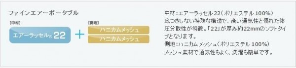 | 素材・材質 | 【中材】 エアーラッセル22(ポリエステル100%) 【側地】 ハニカムメッシュ(ポリエステル100%) |