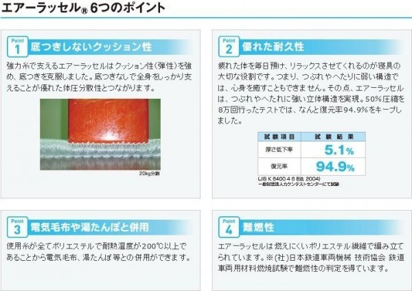 | 強力糸で支えるエアーラッセルは、クッション性(弾力性)を強め、底づきを克服しました。底づきなしで全身をしっかり支える事が、優れた体圧分散性へとつながります。 |