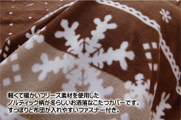 ノルディック柄のこたつ布団カバーです。素材には軽量であたたかいフリース素材を使用しています。すっぽりと布団を入れられるファスナー付きです。洗濯機で丸洗い可能(ネット使用)で、いつでも清潔にご使用頂けます。