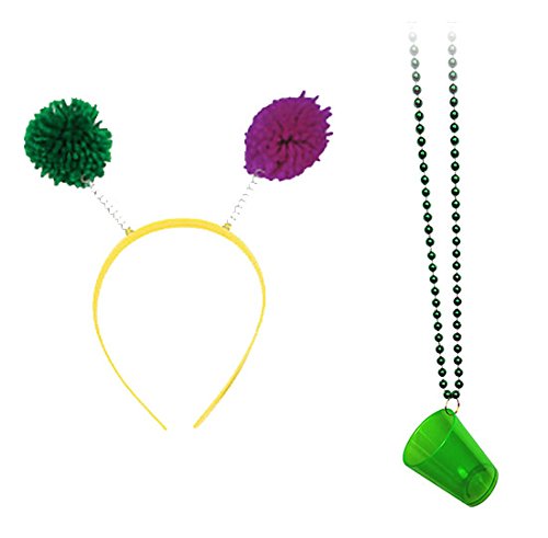 Mardi Gras Boppers Yarn Puff Balls Headband + Shot Glass Bead Necklace