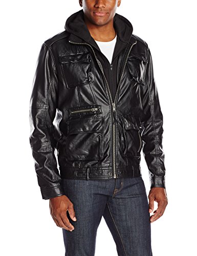 Product DescriptionFaux leather hooded field jacket with removable knit hooded panel0