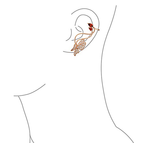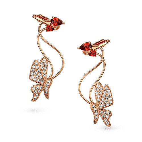 Add darling whimsy with a fresh feel to your look with these ethereal, rose gold plated brass, ear crawler earrings. Featuring vivacious, cz adorned, butterfly motif with simulated garnet stone accents. A disctinctively lovely choice for a January birthday.