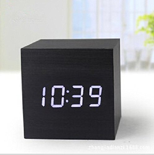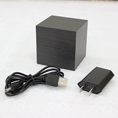 Elloapic Elloapic Bamboo Wooden Design Decorative Desktop Digital Alarm Clock with Time and Temperature Display Sound Control-Size:64mmx64mmx60mm-With Adapter&USB Cable (Black Skin White LED)