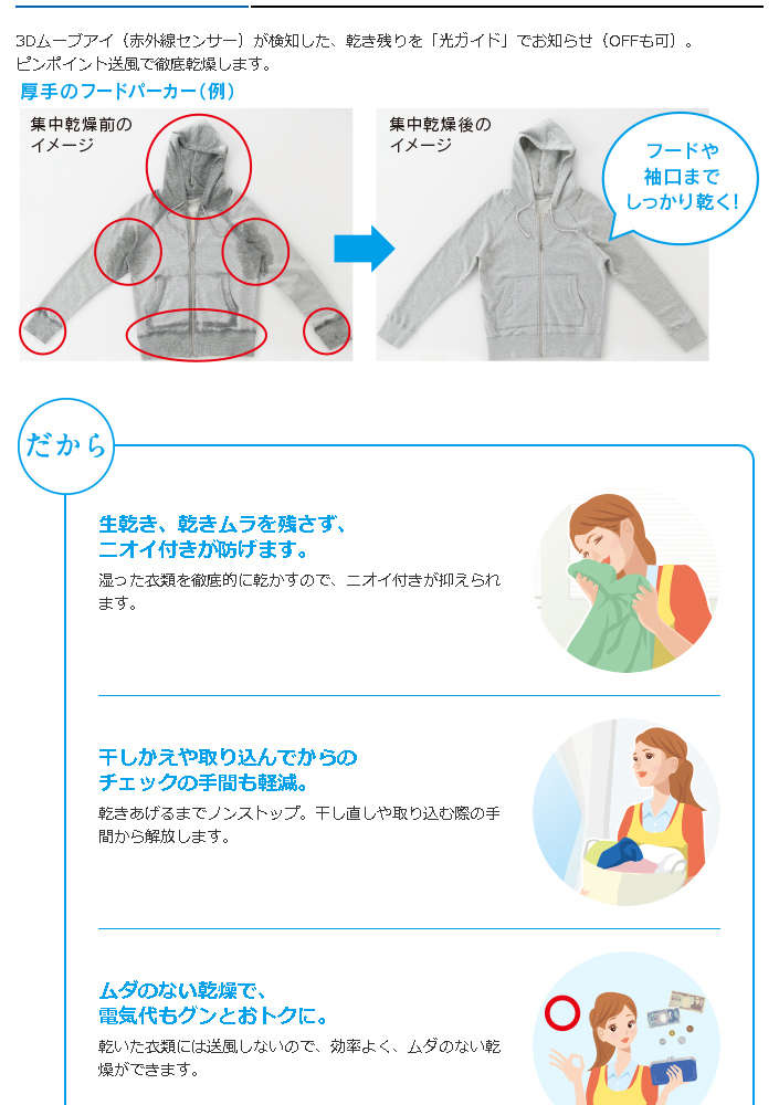 ●「全体乾燥」+「集中乾燥」で乾きにくいモノも、カラッとうれしい仕上がりに。