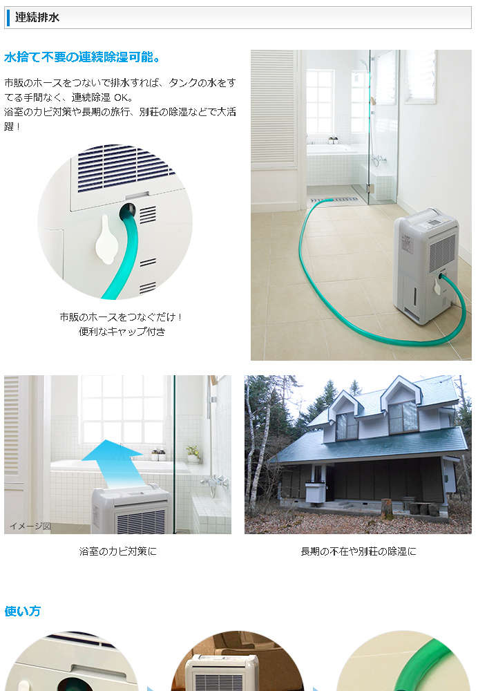 ●タンクの水捨て不要!ホースを繋げば連続除湿
