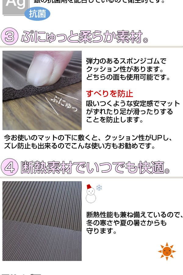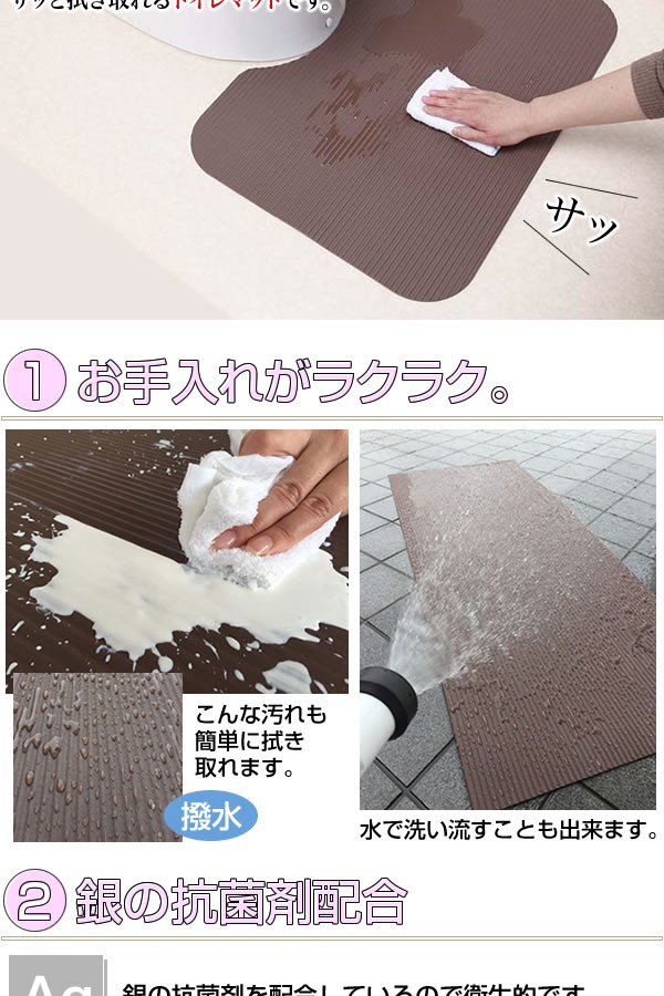 | ゴムのスポンジ素材でできたトイレマット。水をはじくので汚れてもサッと拭くだけ。ゴムだから滑りにくくクッション性もあります。抗菌剤配合で衛生的、断熱性もあり床からの冷えもブロック! |