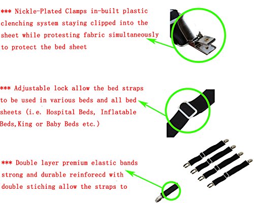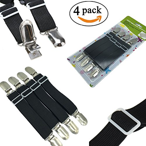 - Bed Sheet Elastic Suspenders Clips LIFE SAVES: With the strong build of these straps, your bed sheet will stay in place for a long time and keep your bed looking great at all times;Never worry about messy or wrinkled sheets again. Make your life easier;Perfect for various beds (i.e. adjustable beds, hospital beds, inflatable beds, etc.) and all bed sheets (i.e. fitted or flat sheets). fitted sheet holder,bed sheet holder straps,bed sheet corner clips grippers straps,sheet clips,sheet holders