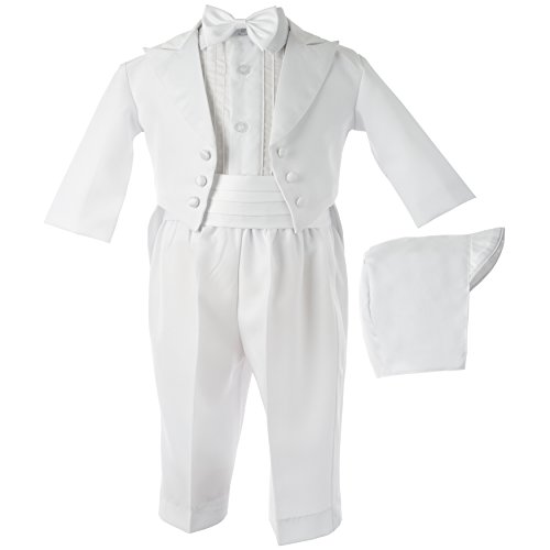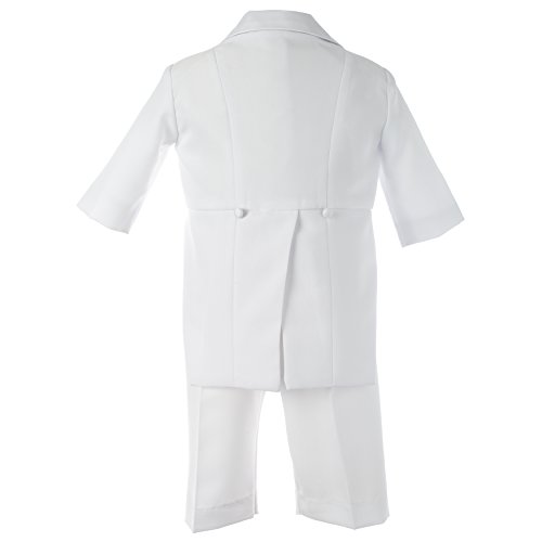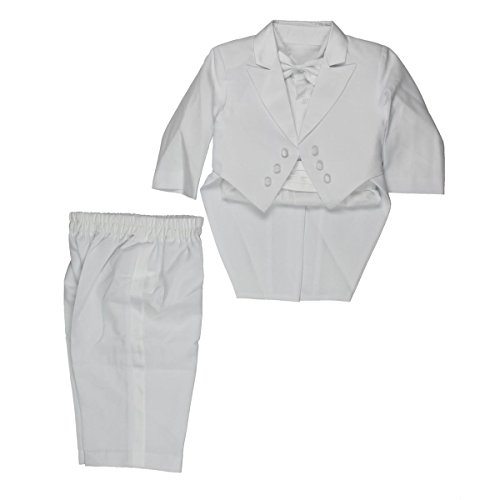 5 Piece Set includes jacket with satin lapels and tails, pants with satin stripe on sides, shirt, cummerbund and matching hat.