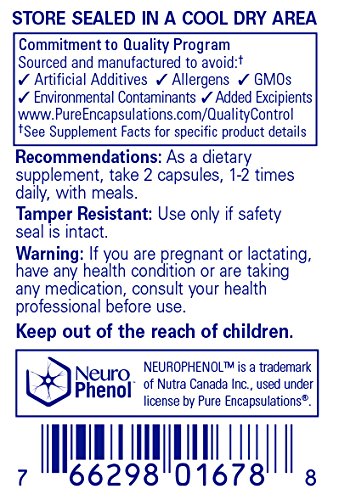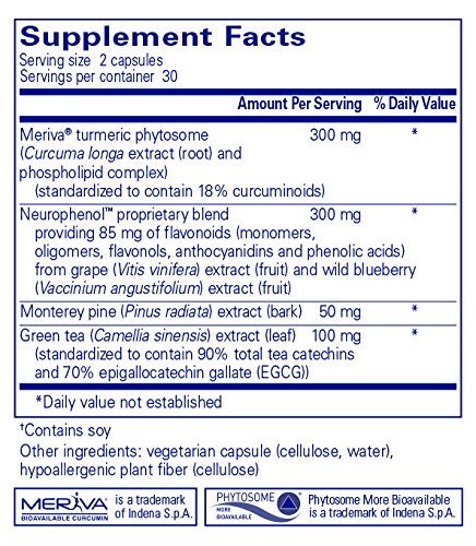 -. Feature : EMOTIONAL WELLNESS: Curcumin and polyphenol blend to support mood, memory and mental sharpness.* / ANTIOXIDANT SUPPORT: Curcumin and other polyphenols support neuronal stability and function, in part by promoting healthy cytokine balance and antioxidant defenses.* / RELAXATION SUPPORT: Research sests that polyphenols may also offer support for occasional stress and mental alertness.* / PURE INGREDIENTS: Pure Encapsulations® manufactures a line of hypoallergenic, research-based dietary supplements. Products are meticulously formulated using pure ingredients designed to deliver predictable results for the benefit of all patients, even the most sensitive.* / FREE FROM: At Pure Encapsulations, our product are free from wheat and gluten; egg; peanuts; coatings and shellacs; GMOs; magnesium stearate; trans fats and hydrogenated oils; artificial colors, flavors and sweeteners; unnecessary binders, fillers and preservatives. Any product containing ingredients derived from allergens, such as soy, dairy or shellfish, is clearly labeled. All two-piece capsules are hypoallergenic and vegetarian.