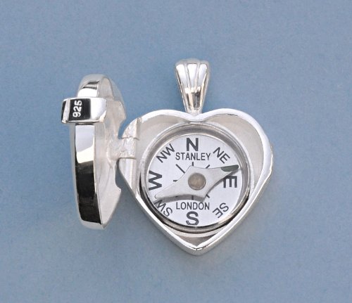 The Elegant Heart Design Sterling Silver Compass Locket has a beautiful brushed finish. These quality Sterling Silver compass lockets have ornate hinged covers that open to reveal 5/8 inch (15.87 mm) diameter working compasses. The Elegant Heart Shaped locket weighs 0.41 ounces, measures 7/8 inch (22 mm) wide, 13/16 inch (21 mm) tall, and 7/16 inch (9 mm) thick. The lockets are stamped "925" to designate the quality Sterling Silver content (92.5% pure silver). The larger Elegant Heart Design Sterling Silver Compass Locket has nearly twice the silver content of the Classic Swirl and Compass Rose lockets, which significantly contributes to the price difference between the lockets. This locket and chain come in a high quality hinged gift box. Our Elegant Heart Design Sterling Silver Compass Locket is also offered with a 17.5 inch sterling silver chain.Feature