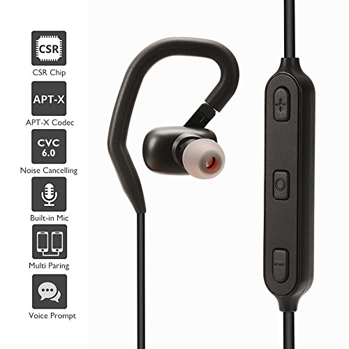 Wireless Bluetooth Headphones for Sports, IPX4 Sweatproof Bluetooth Headset, Secure Fit Over Ear Hook, 8hrs Play Time, apt-X Codec CVC 6.0 Noise Cancellation, Built-in Mic