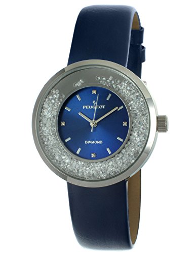 Spoil yourself with Sparkle- with Peugeot Floating Crystal and Diamond dial marker watch. Over 350 sparkling CZ stones free falling in the bezel, while four Genuine Diamonds on the dial are hand set at the 12,6,9,3 hour position. The silver plated case with blue dial is matched with a smooth shiny blue calf strap that gently hugs you wrists. The Peugeot #3041 is fitted with a reliable Japanese quartz movement and is backed by Peugeot's exclusive Lifetime Warranty including free battery replacement. This show piece is luxurious yet affordable and not just for telling time but an attention grabber and a conversational piece. Other color choices available.Feature