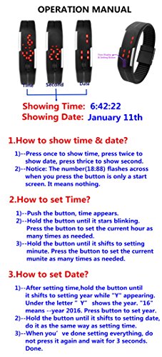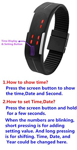 Studio : Top Plaza Publisher : Top Plaza Binding : Watch Product Description This LED touch screen watch can display time and date, perfect choice for your family life. Features: Stylish and exquisite appearance, small and lightweight. Silicone strap design, it is soft and comfortable to wear. It can display time and date, with large font for easy reading. Suitable for both women and men, perfect choice for your family life. How to set time? 1.Press your finger to the screen down and the time is displayed. 2.Press the button (screen down) --> Hours/Minutes Shows * When it shows, long press on the screen until the hour blink --> Hour blink, minutes are steady. short push on the screen cycle through the hours * Long press on the screen again, Hours are steady, Minutes blink --> Short push on the screen cycle through the minutes * Long press on the screen again, Shows "y 13" for Year 2015. --> Short push on the screen cycle through the Years * Long press on the screen again, Shows Month:Day. Month is blinking, day is steady --> Short push on the screen cycle through the Months * Long press on the screen again, Shows Month:Day. Month is steady, day is blinking --> Short push on the screen cycle through the Days * Long Press and it goes back to normal display