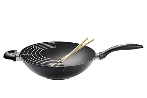 Luxurious Danish design, traditional, solid craftsmanship and the latest advances in technology combine to make Scanpan IQ the new cookware generation. Scanpan IQ is hand-crafted, squeeze-cast in recycled aluminum. IQ Cookware is suitable for induction and all other cook tops. The optimum thickness of the pan base prevents warping and keeps the pan base perfectly flat, especially important when used with glass top or ceramic ranges. The pan thickness and unique ceramic-titanium surface allows for browning, searing and deglazing. The patented nonstick surface is created by firing ceramic-titanium particles into the pan and a specially formulated nonstick compound is embedded in the ceramic-titanium surface. Durable surface allows use of metal utensils. Scanpan Green Tek non-stick surface is PFOA-free in all stages of the manufacturing process. Scanpan IQ Cookware can be used with high heat frying and is oven safe to 500-degrees. IQ Cookware features ergonomic handle design and lid knobs. Includes Chopsticks and stainless steel Rack.Feature