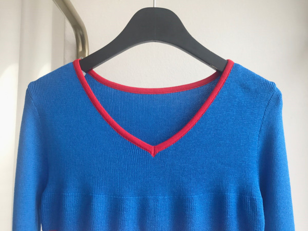 와이드하게 들어간 브이넥 라인 덕분에